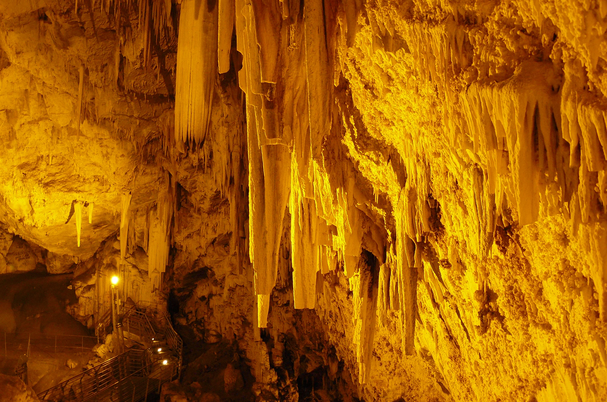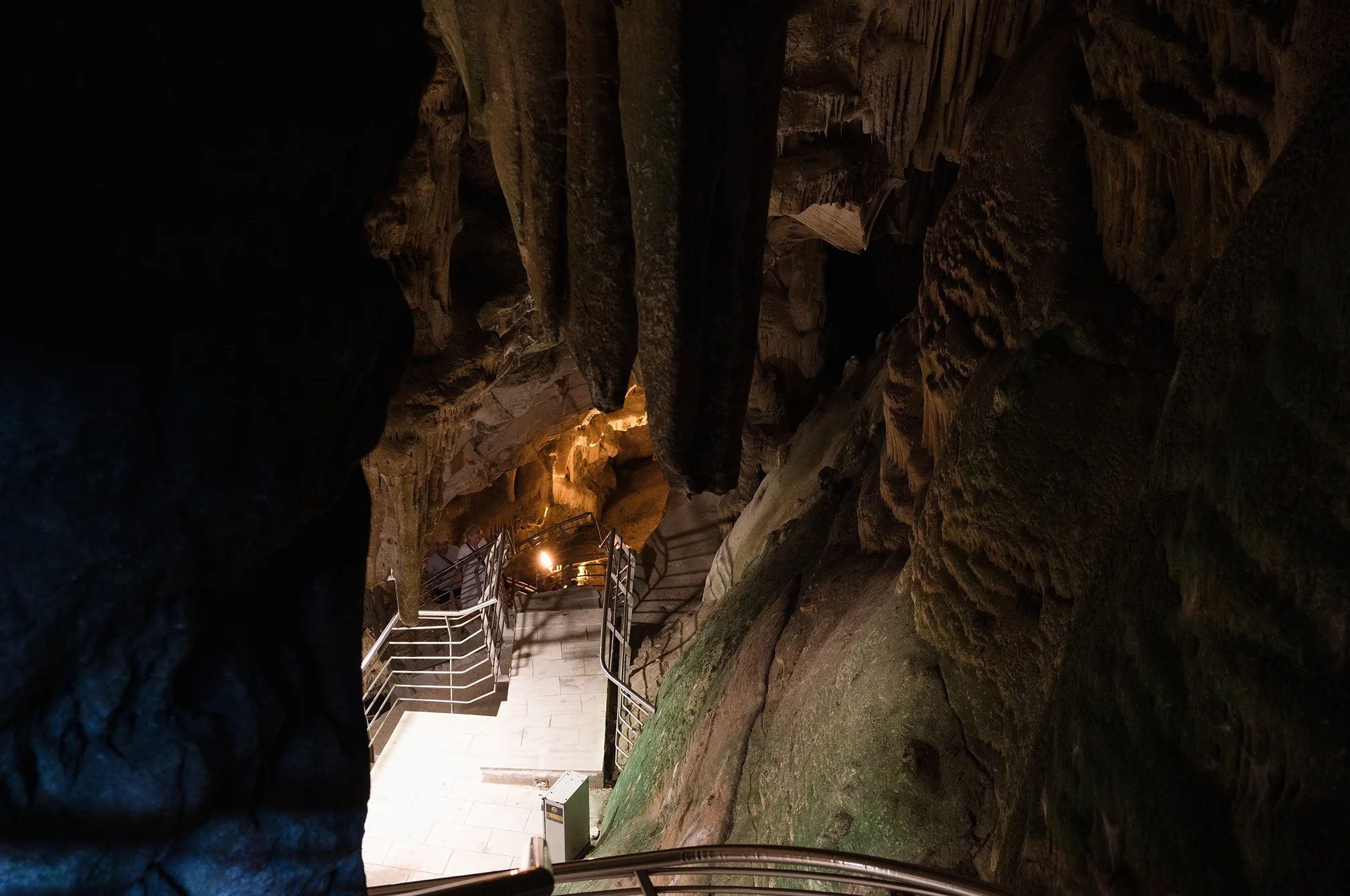 Stairs take you deeper past hanging stone forms and cooling air, where every echo seems to carry a story. It’s an experience that draws you inward, into something elemental and rare.